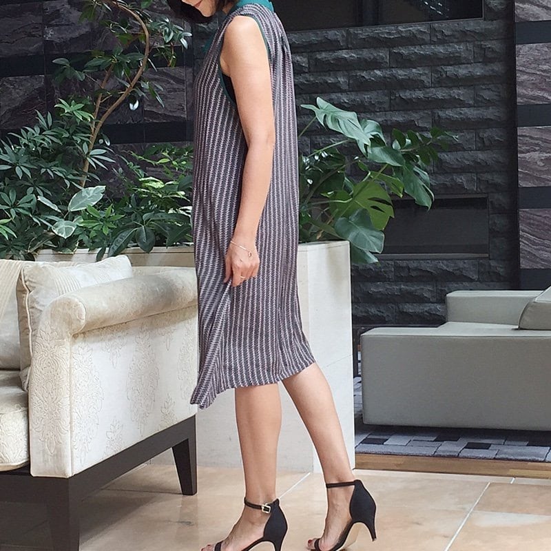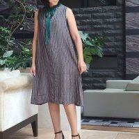 シックな色味が素敵なワンピース。胸元のリボンが可愛らしさを演出します。きれいなラインを作るゆったりしたフレアデザインなので、涼しく楽に着て頂けます。